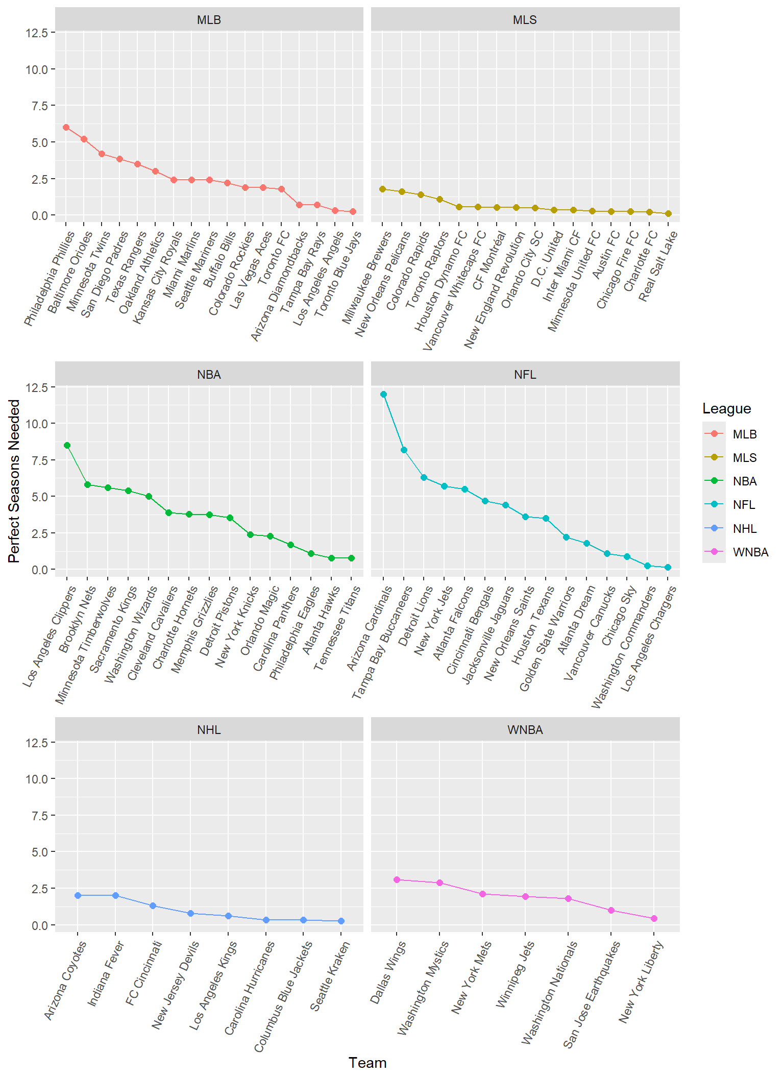 = ggplot(dataset, aes(x = reorder(Team, -Perfect.Seasons.Needed), y = Perfect.Seasons.Needed, group = League))+