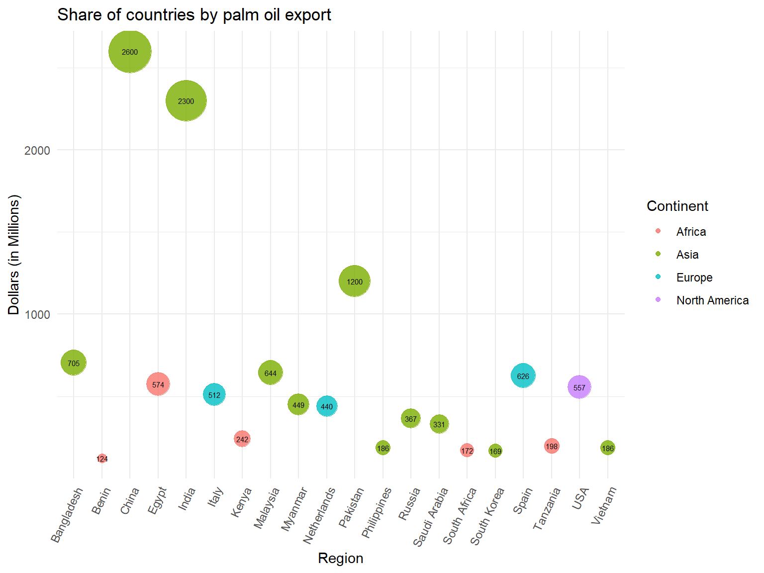 labs(title = "Share of countries by palm oil import", y = "Dollars (in Millions)", x = "Region", fill = "Continent") +